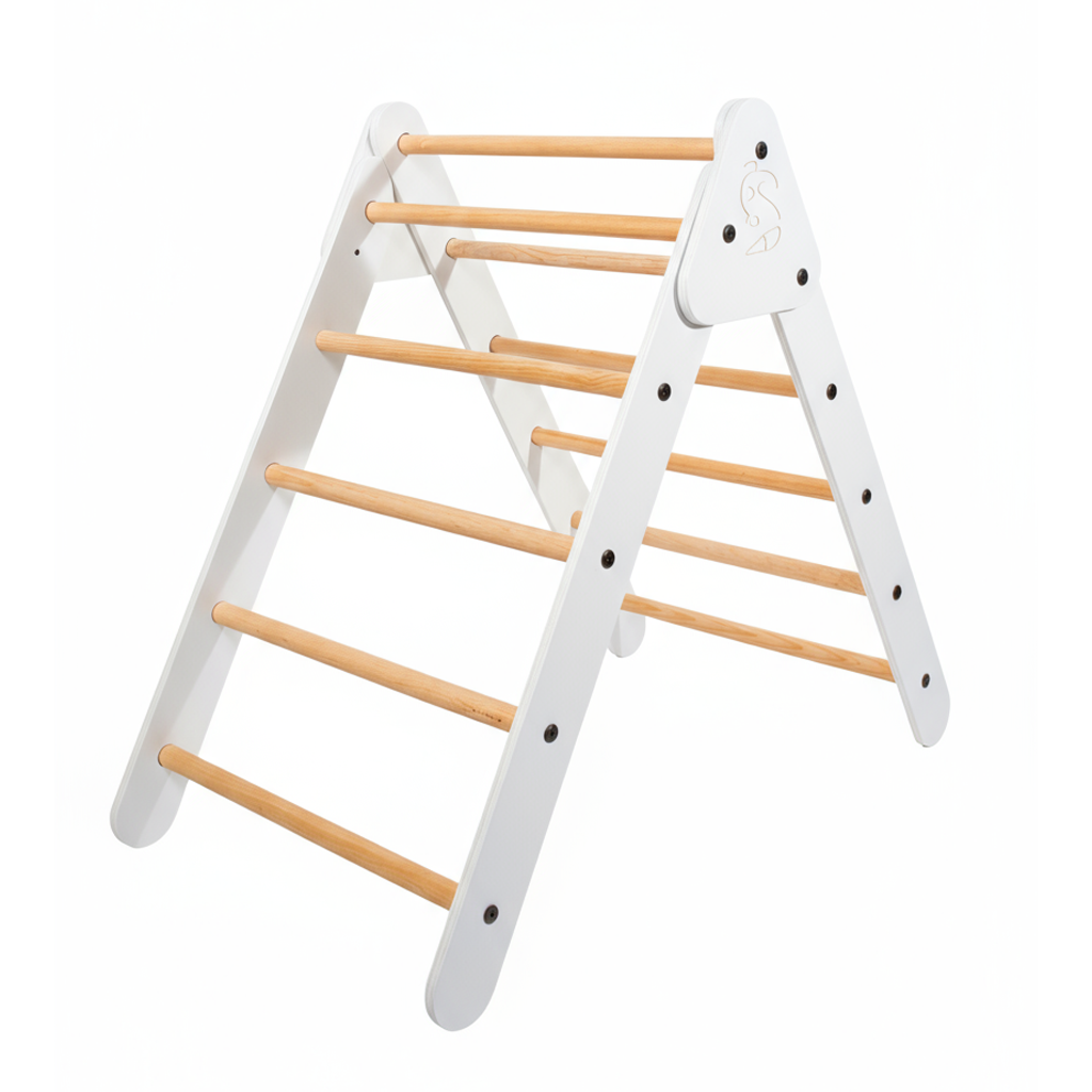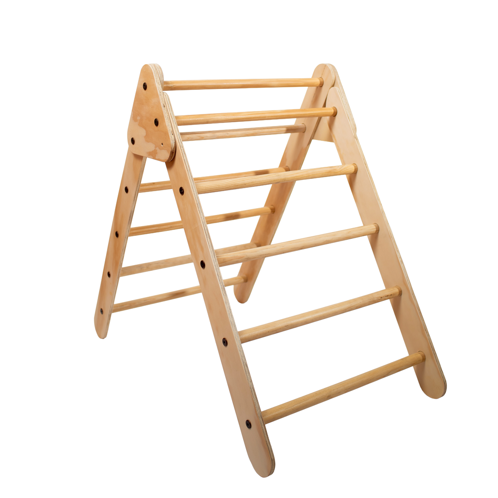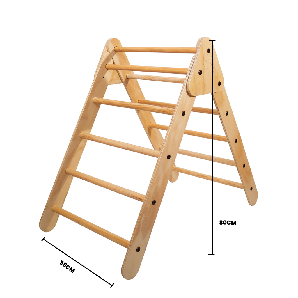 El triangulo Pikler es un elemento de juego intuitivo en madera que ayuda a potenciar el movimiento, la coordinación y desarrollo motor en los bebés, niños y niñas, su estructura triangular con peldaños les permite trepar, escalar, explorar diversas formas y moverse de manera segura por si mismos, Un fantástico juego de uso domestico